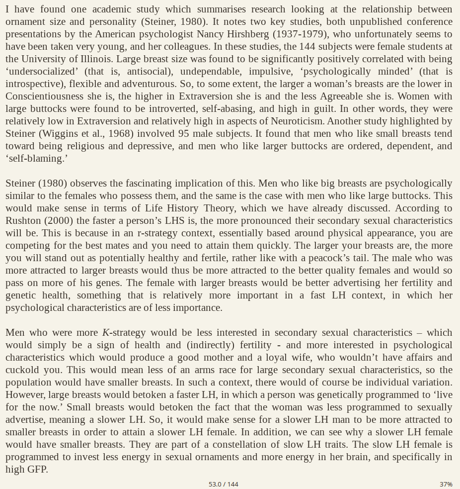 >The female with larger breasts would be better advertising her fertility and genetic health, something that is relatively more important in a fast LH context, in which her psychological characteristics are of less importanceYep, big aryan breast is evolutionally more preferable.