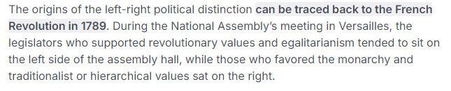 >Let's say you set it at the birth of the left-right divide; this would mean 99.999% of the population nowadays is leftistNo, I don't need to set it at the birth of the left-right devide. As I have said, we still have the same traditions. Anyone, who declines it and tries to find something new is leftist. Those, who accept it and build their nation in accordance with tradition are rightists.
