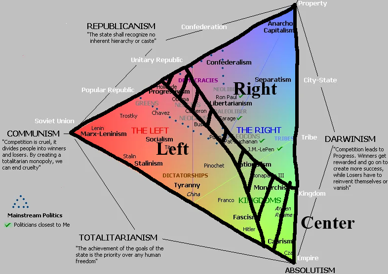 >>6291okay? Not my point. Remove the left-right divide completely, it is meaningless in that framework. Any definition of the left-right divide that clumps together literal Anarchists and Absolutists is retarded. The Capitalism-Socialism one is the best, but it also doesn't really fit that triangle. Honestly, now that I look deeper into it, I think it's ok. The labels and position of figures/nations is REALLY retarded though; look at China, for example