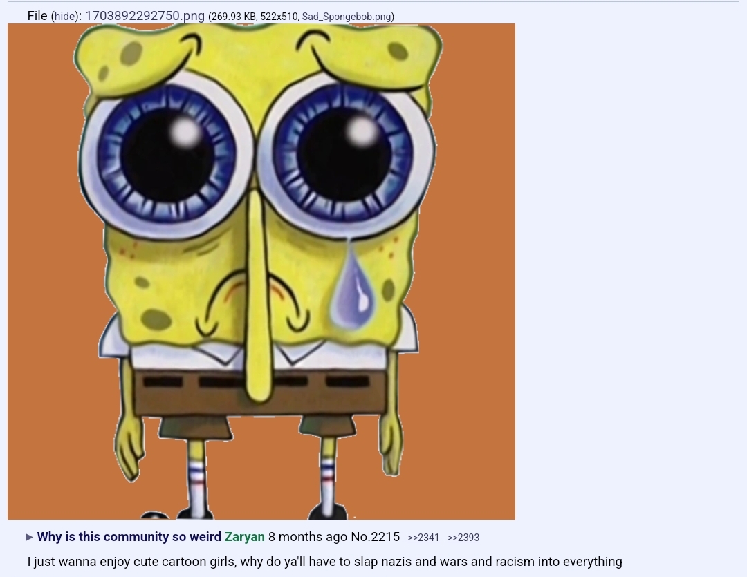 If that was the case we wouldn't have this discussion, as every zellig poster was once a newGOD that got "brainwashed", i.e. simply liked the show. If anything, we were so successful that people who didn't want zellig being posted on a soyjak website because it hurt their delicate feelings didn't have any other way to stop it, like counter-brainwashing into believing it's "forced coal", that they had to start the most intensive and most consistent "ban everything I don't like" bitching campaign in the history of the sharty, eventually forcing jannies to actually remove it.