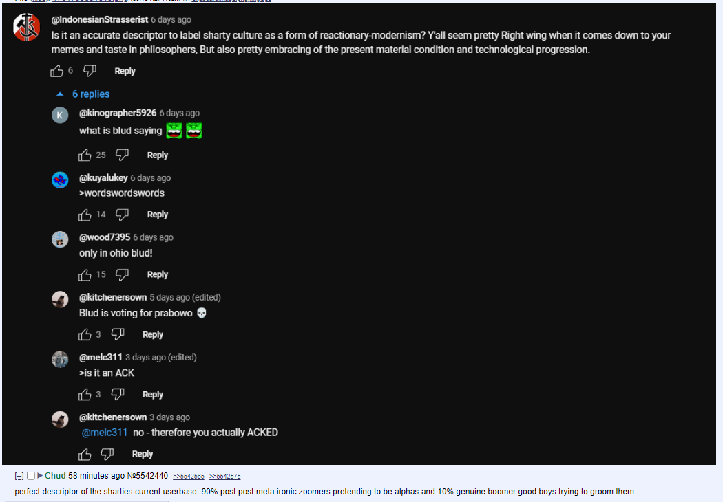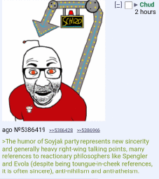 If you think about it, they're kinda right. With how spread postmodernism has been to modern internet culture (causing degeneracy among the cord, Twitter, Preddit, and 4cuck), and with /qa/ and sharty culture making fun of them, I believe that soyjak.party could lead the next internet age into new sincerity if done properly. (New Sincerity basically means using irony in a sincere way, circling back to having traditional values)