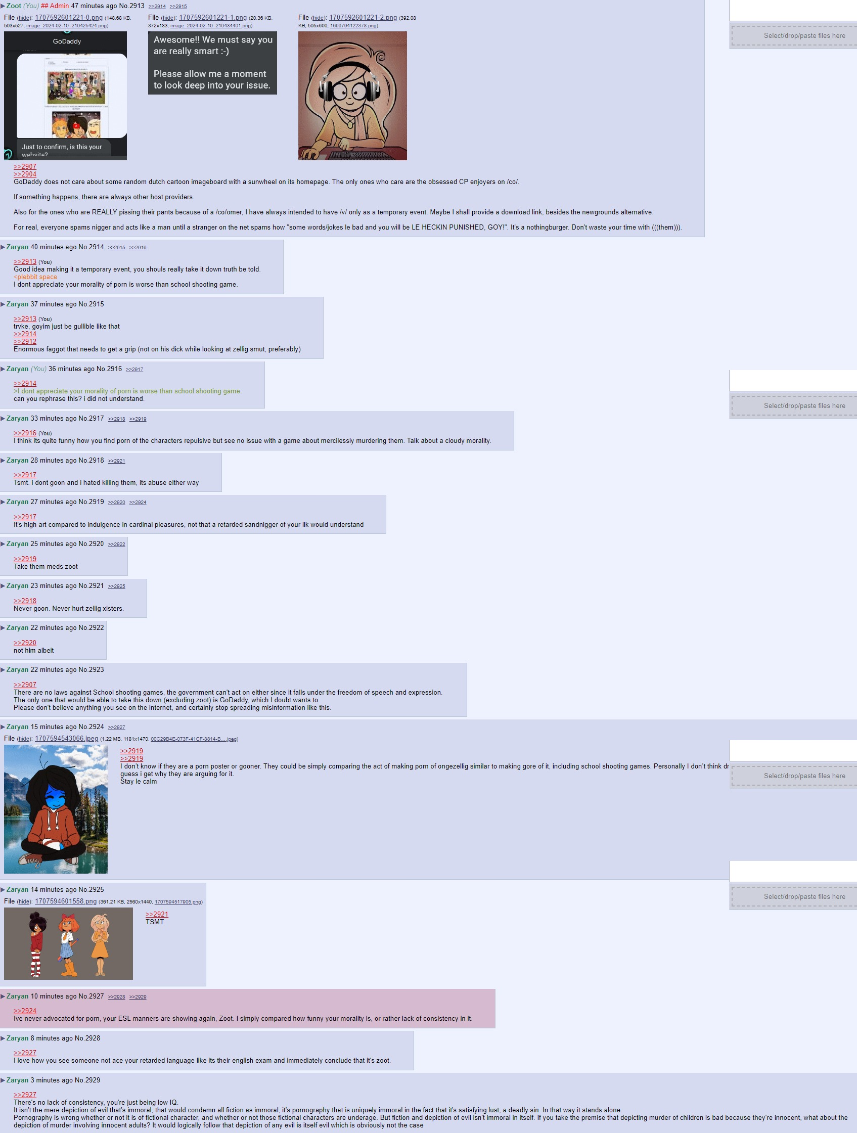 >>2907>>2904GoDaddy does not care about some random dutch cartoon imageboard with a sunwheel on its homepage. The only ones who care are the obsessed CP enjoyers on /co/.