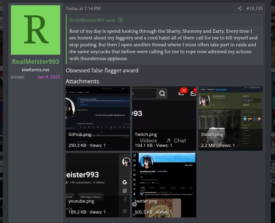 >>8068zaryan… I don't know how to tell you, but… creating false flag accounts on two websites and reposting them here is extremely obsessed