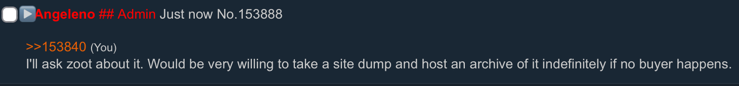 Another thing I’d like to add is that we have known this for a long time, we just decided not to tell you. We don’t want you to believe it’s completely over, the site is still purchasable. I just feel like you all deserve to know since it’s been a topic popping up from time to time, maybe I’ll make a thread on /q/ about all summed up.
