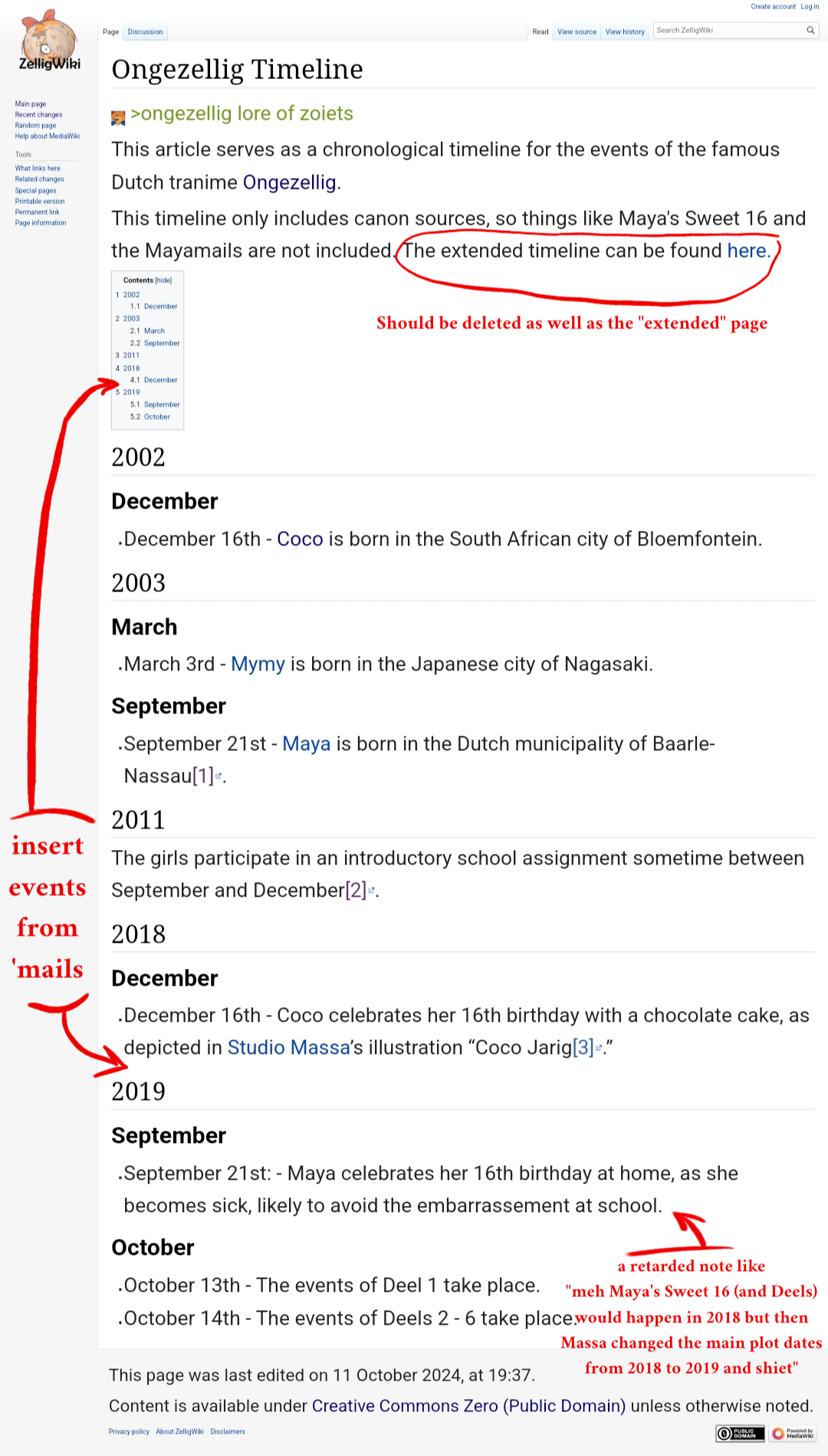 >Updating "/co/", such as adding info about the /co/ntests for Miss. /co/, the board agreement between users to not post Ongezellig again, etc.>Adding information in the "4chan" article about /qa/>Updating "Cam" to inform the users of xhis online whereabouts and involvement in Project GOY>Adding images in the "Cleo" article>Updating the articles of "Maya", "Mymy", "Coco" and "Vera" to include every new piece of lore introduced with the mayamails and the 'cord doc>General grammar and ESL check on all articles>Updating the "GET" page to include the last 15k posts.>Current activities of "Grim">Updating the "Kiki" page to include the unused voicelines and other info from the doc>Updating the "Ongezellig timeline"<ZARYAN SPACEThere's still a ton to do but these are the oldest dustiest articles which didn't get updated in a while