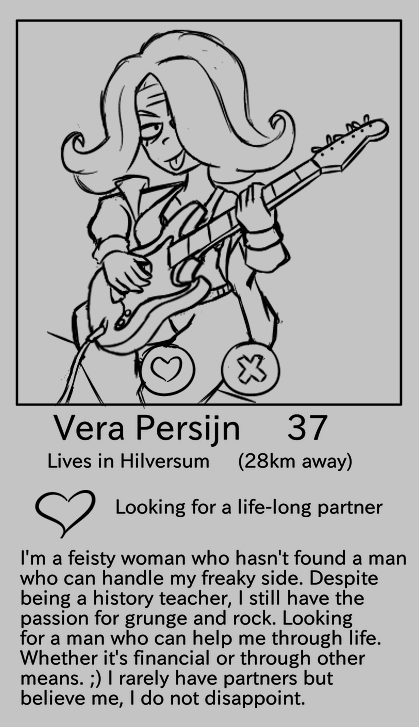 Maya also likes music, and you could argue she likes the same alternative rock that Vera would have liked if she was born later, she dreams of playing an instrument, daydreams in the shower of just being out in the open and playing a guitar, she tries to go to a concert with Epke and Enke (it was scrapped as an idea albeit) but doesn't find the courage. And thanks to the massive autism here, we also know that Maya is not going to have a great life, she will try to pursue something, fail at it, then settle for something worse, and she'll end up even more bitter and alone.