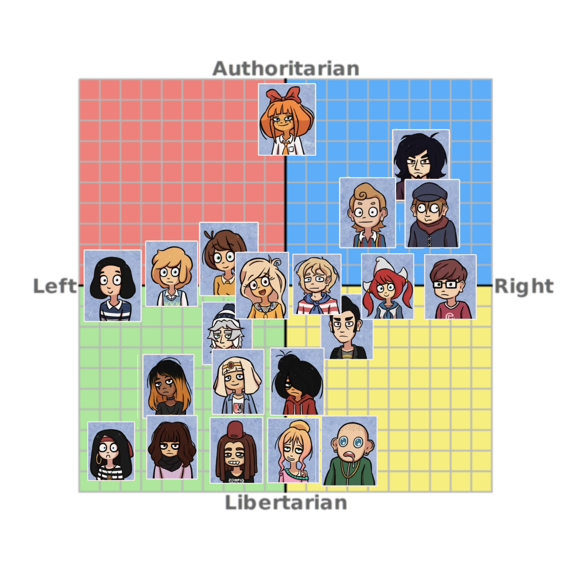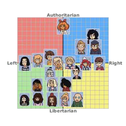 Maya is 100% a centrist, maybe more lib-leaning than authoritarian, but regarding left vs right thing she’s a fence-sitter. Too indifferent about anything other than her own social struggles to care about those of a collective society. Politics don’t matter to her. She probably doesn’t vote either. Whatever government would be in charge of her country, it would work for her. What happens outside of her own bedroom is none of her concern as she just wants to sit inside and goon all day. Mymy is clearly authoritarian, no doubt about that, but whether she’d be more left or right leaning is difficult to decide. The poster behind her during her presentation in deel 2 was inspired by a Mao poster but there’s a lot about her behavior that overlaps perfectly with online Dutch right-wingers too (talking about her VOC obsession and hatred for Belgium). A lot of communist leaders that we know didn’t practice what they preached so it’s not like the whole left-right bullshit matters when we’re talking about dictators